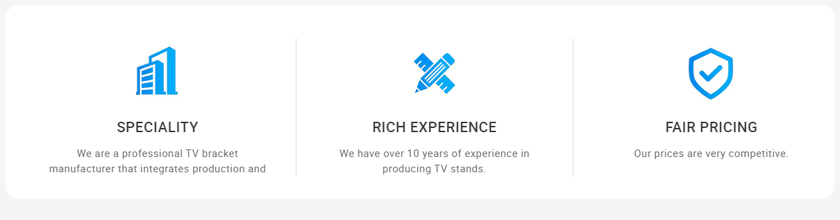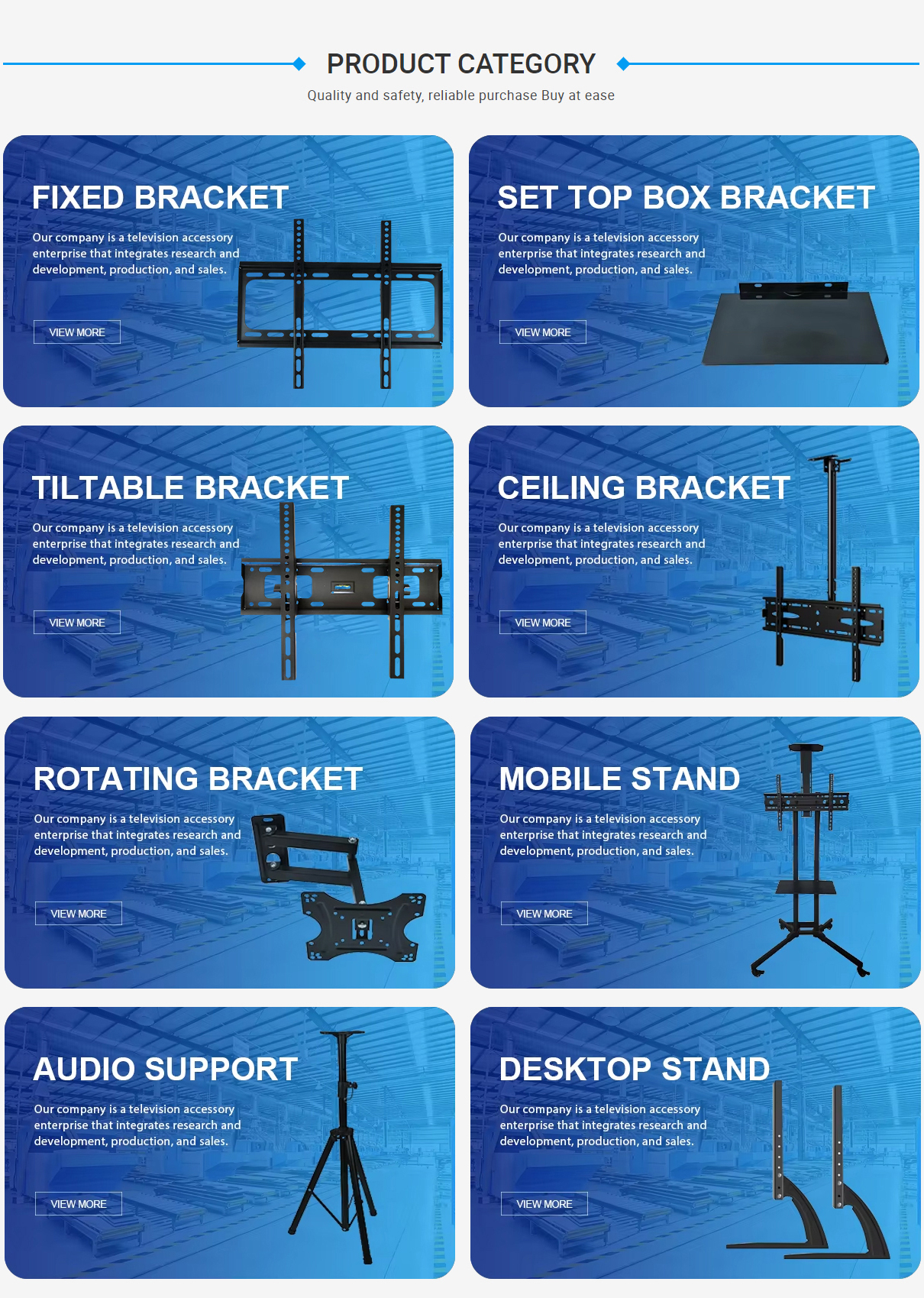 主な製品:テレビ回転ブラケット、テレビブラケット、オーディオブラケット、セットトップボックスブラケット、テレビモバイルスタンド